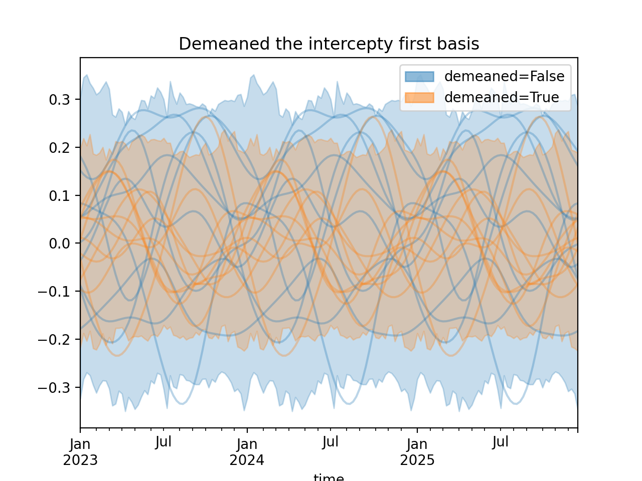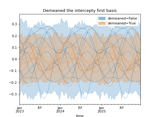 import numpy as np import pandas as pd import xarray as xr import matplotlib.pyplot as plt from pymc_marketing.mmm import HSGPPeriodic from pymc_marketing.plot import plot_curve seed = sum(map(ord, "Periodic GP")) rng = np.random.default_rng(seed) scale = 0.25 ls = 1 kwargs = dict(ls=ls, scale=scale, period=52, cov_func="periodic", dims="time", m=20) n = 52 * 3 dates = pd.date_range("2023-01-01", periods=n, freq="W-MON") X = np.arange(n) coords = {"time": dates} hsgp = HSGPPeriodic(demeaned_basis=False, **kwargs).register_data(X) hsgp_demeaned = HSGPPeriodic(demeaned_basis=True, **kwargs).register_data(X) def sample_curve(hsgp): return hsgp.sample_prior(coords=coords, random_seed=rng)["f"] non_demeaned = sample_curve(hsgp).rename("False") demeaned = sample_curve(hsgp_demeaned).rename("True") combined = xr.merge([non_demeaned, demeaned]).to_array("demeaned") _, axes = combined.pipe(plot_curve, "time", same_axes=True) axes[0].set(title="Demeaned the intercepty first basis") plt.show()