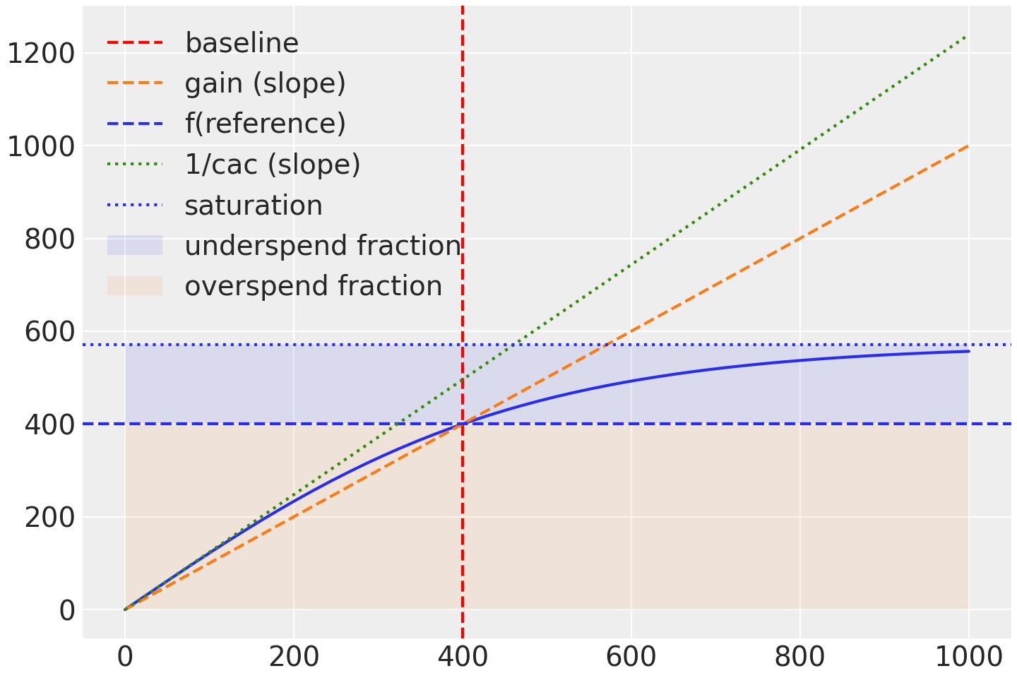 \(1\) - the reference point is already in the saturation region and additional dollar spend will not lead to any new users.