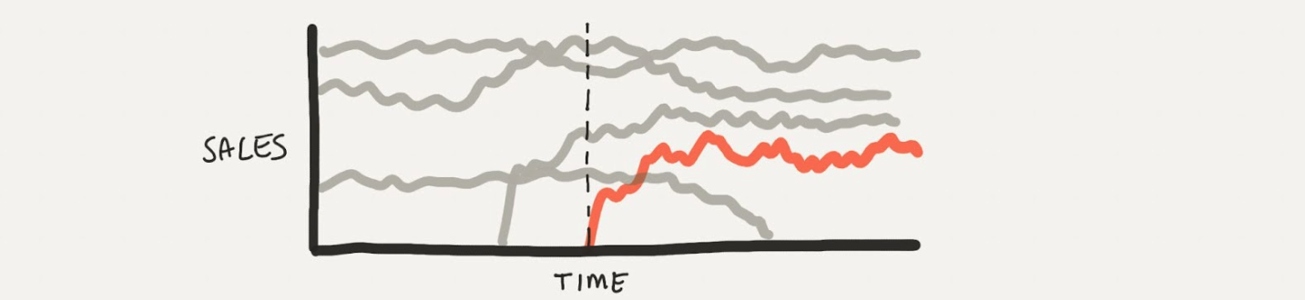To be more precise, we aren’t really able to make this causal inference based on the sales data before new product introduction. Instead, we do it by comparing the actual product sales after the new product introduction to a counterfactual scenario where the new product was not introduced. This is the essence of causal inference in product incrementality. The question is how do we calculate the counterfactual sales?