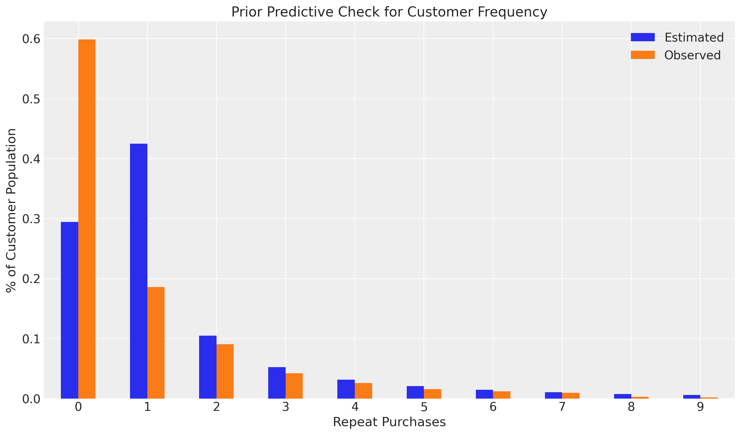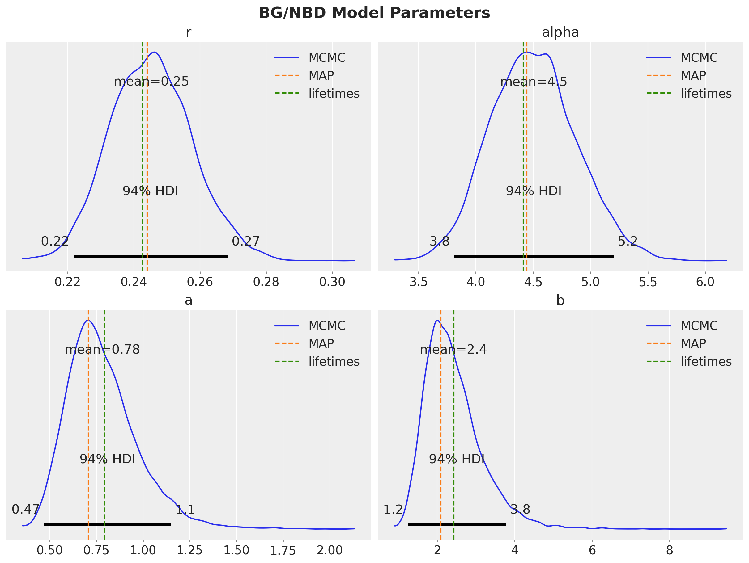 In this notebook we show how to fit a BG/NBD model in PyMC-Marketing. We compare the results with the lifetimes package (no longer maintained). The model is presented in the paper: Fader, P. S., Hardie, B. G., & Lee, K. L. (2005). “Counting your customers” the easy way: An alternative to the Pareto/NBD model. Marketing science, 24(2), 275-284.