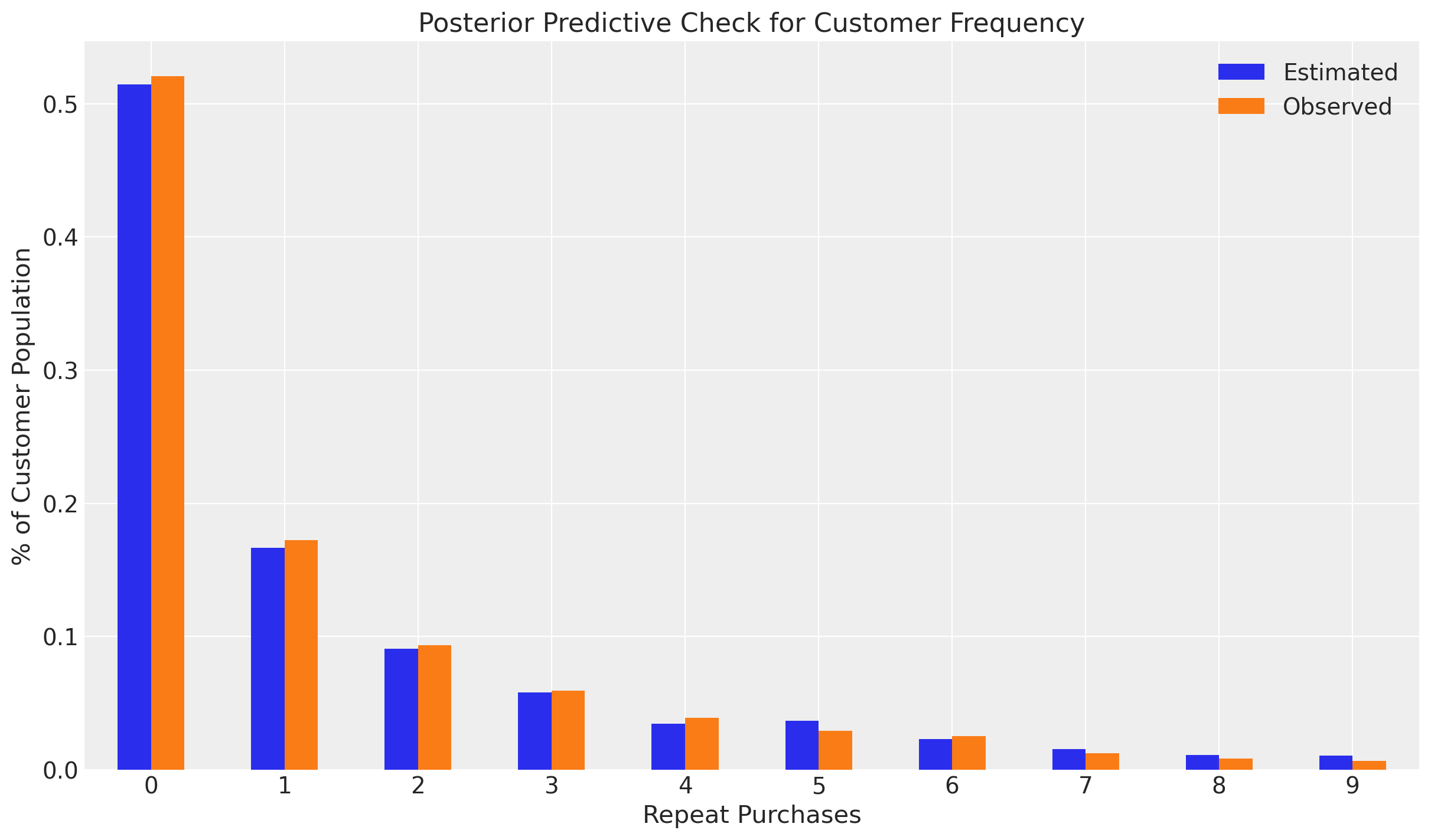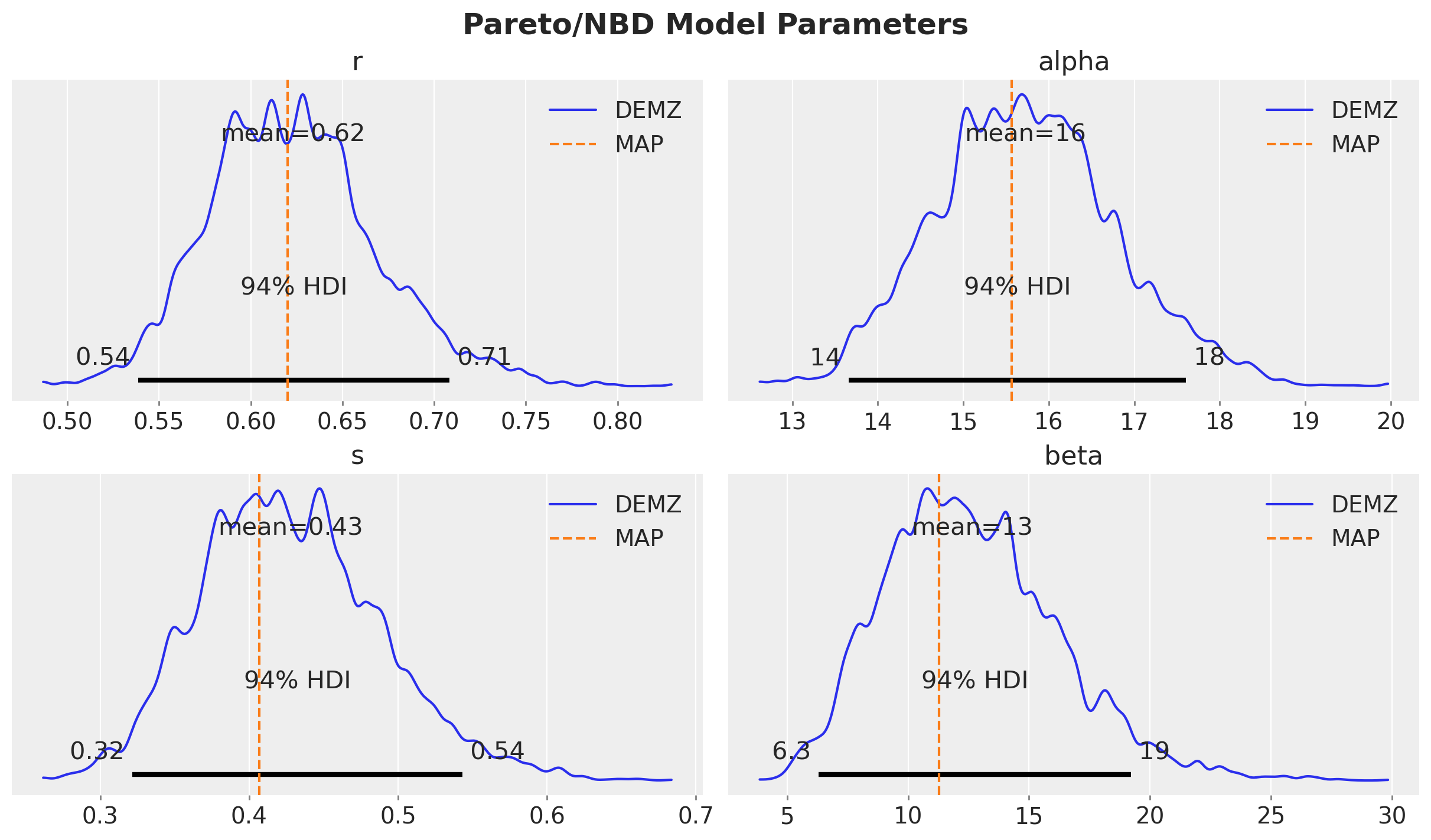 In this notebook we will use Bayesian inference to fit a Pareto/NBD model in PyMC-Marketing, and compare results with the frequentist lifetimes library (no longer maintained). We will also demonstrate the predictive functionality of this model, along with an example for time-invariant covariates.