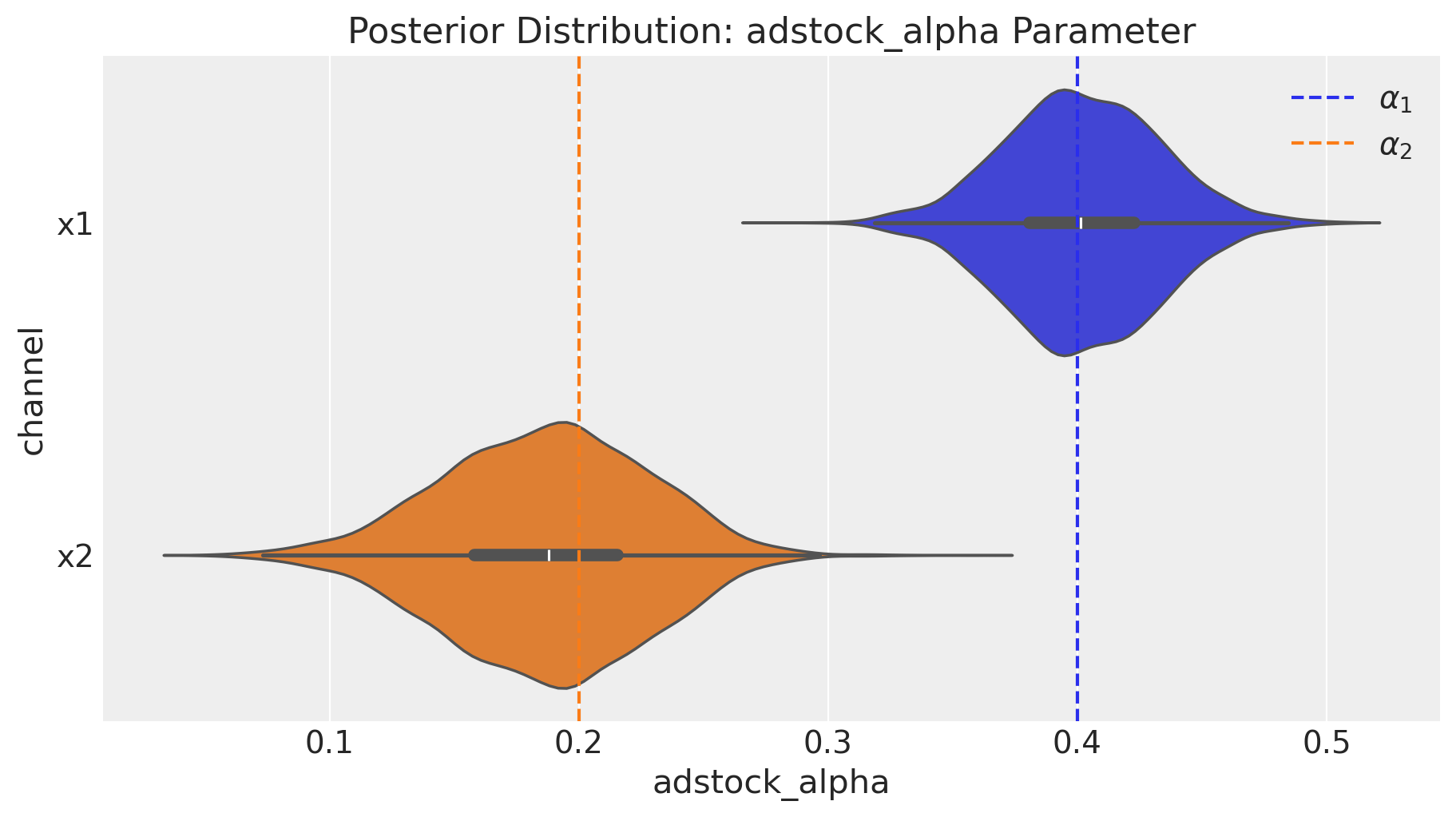 Let’s start with the adstock transformation. We set the adstock parameter \(0 < \alpha < 1\) to be \(0.4\) and \(0.2\) for \(x_1\) and \(x_2\) respectively. We set a maximum lag effect of \(8\) weeks.