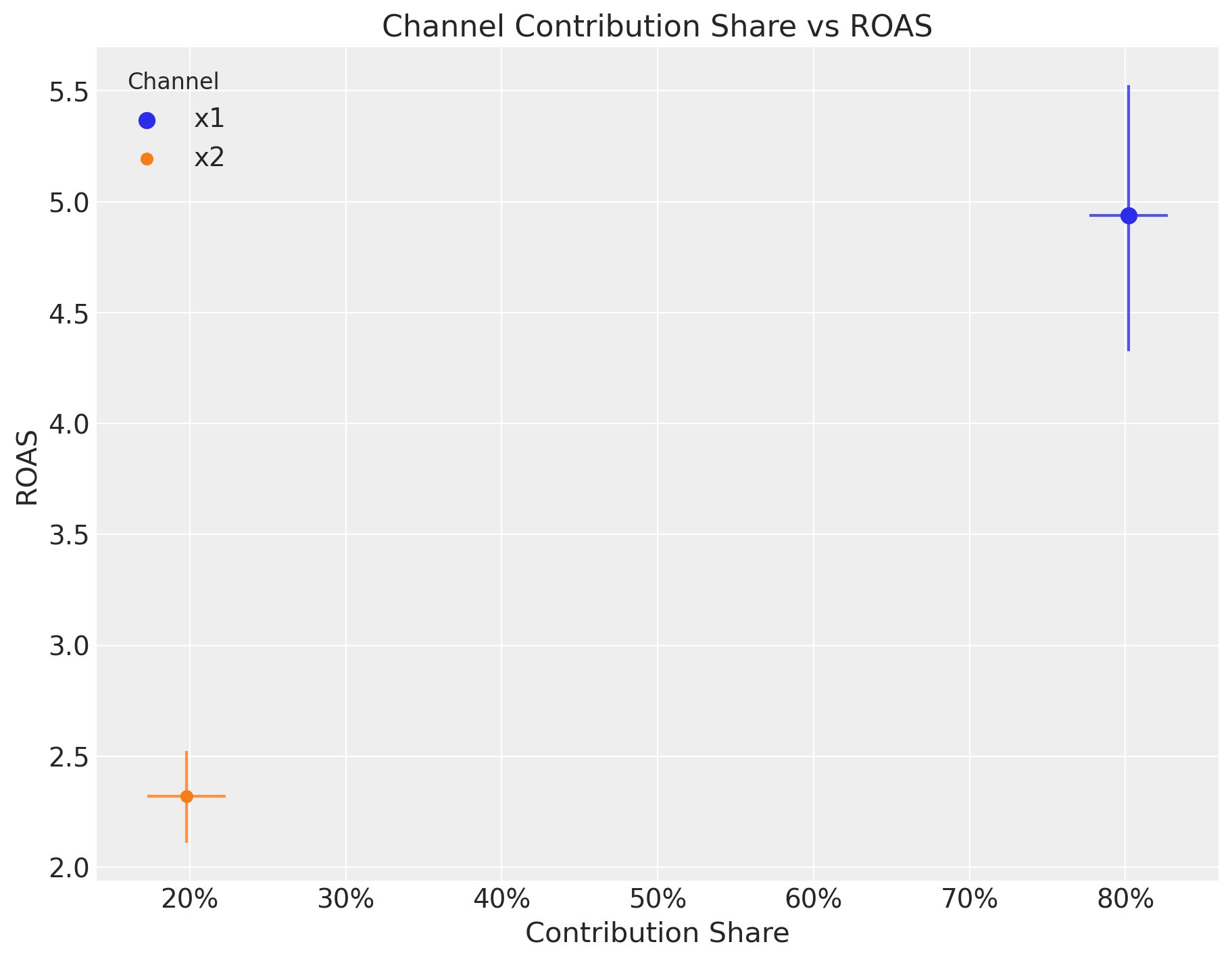 Remark: By design, \(x_{1}\) should resemble a typical paid social channel and \(x_{2}\) a offline (e.g. TV) spend time series.