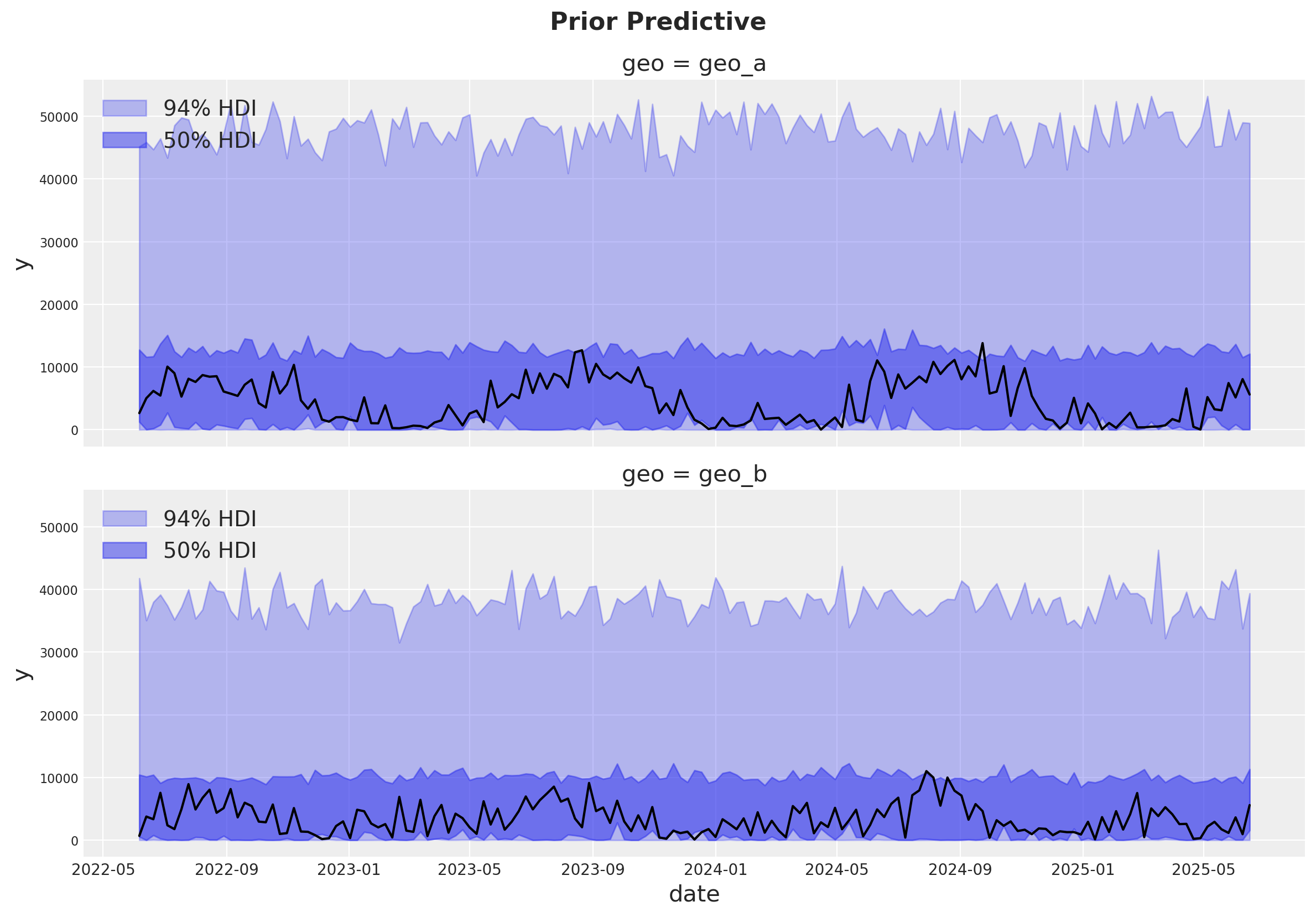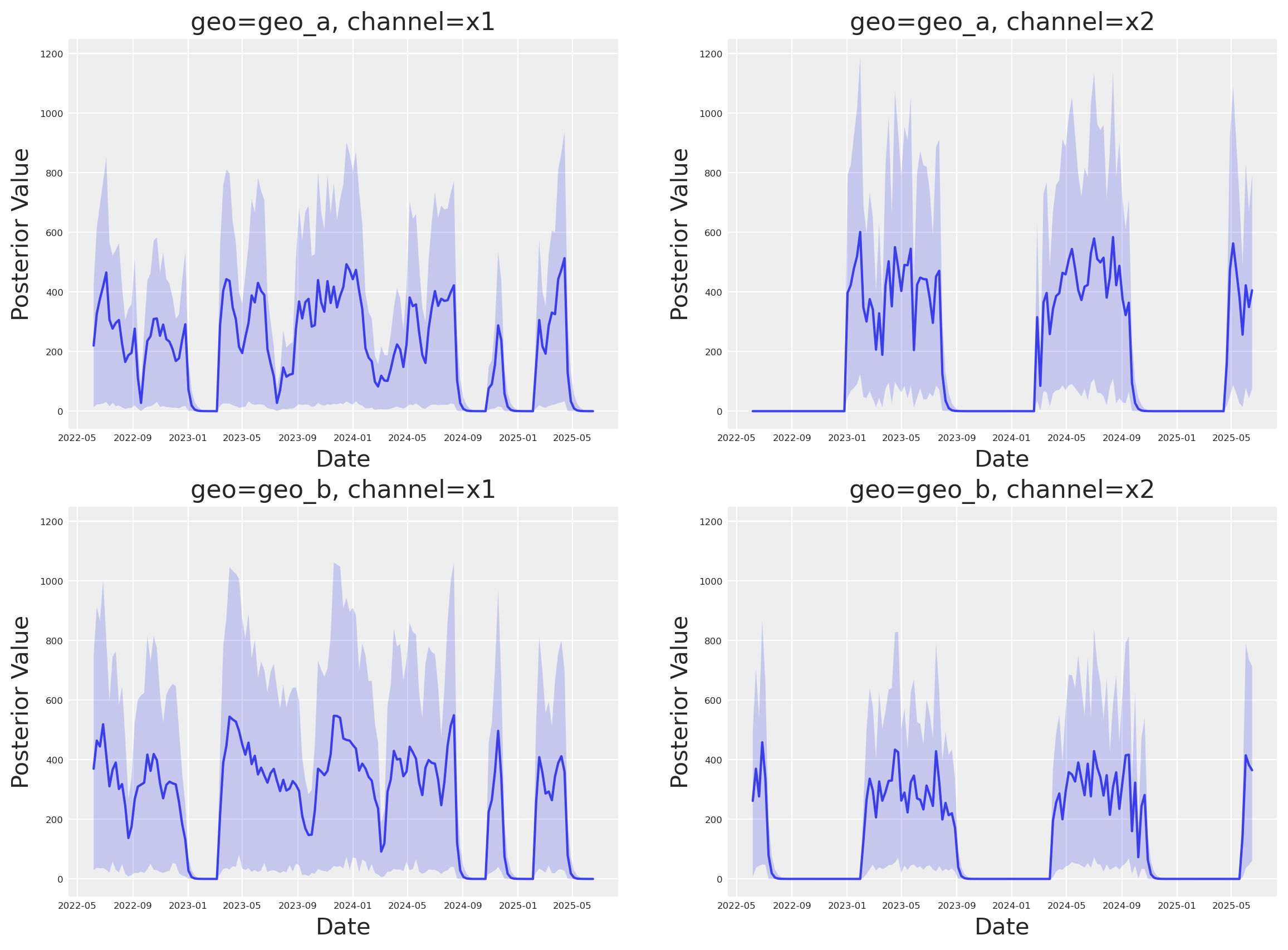 A hierarchical model does something clever - instead of assuming that every geography is different, we assume that they must be at least partially related to each other. If you had 10 geos and 9 of them had a high saturation point, you would reasonably expect the 10th one to have a high saturation point. A hierarchical model will adaptively pool information between contexts. When each geo is very different, it will transfer less information between them. When each geo is very similar, it will transfer more information. This is also called partial pooling. If you need an introduction on Bayesian hierarchical models, check out the comprehensive example “A Primer on Bayesian Methods for Multilevel Modeling” in the PyMC documentation.