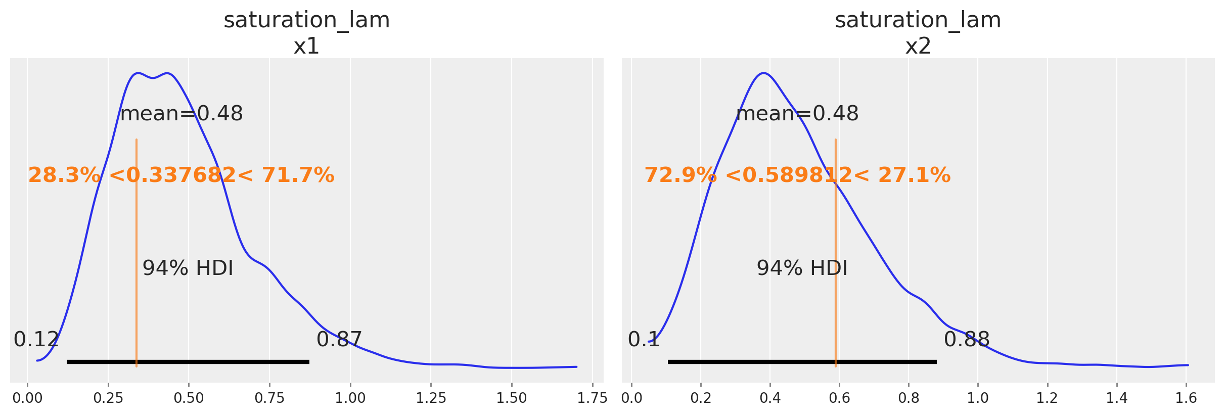 This notebook is only illustrative so we’ll show you how to code each type of assumption you might make (we aren’t recommending a universal solution!). Lambda represents the efficiency of a channel. The higher the lambda, the more responsive sales are to spending on that channel. We’ll have the lambda parameter be fully pooled across all geographies. We are assuming that channel 1 has the same efficiency in both geos, so we do not specify “geo” dims. The package will automatically broadcast the channel effect for each geography.