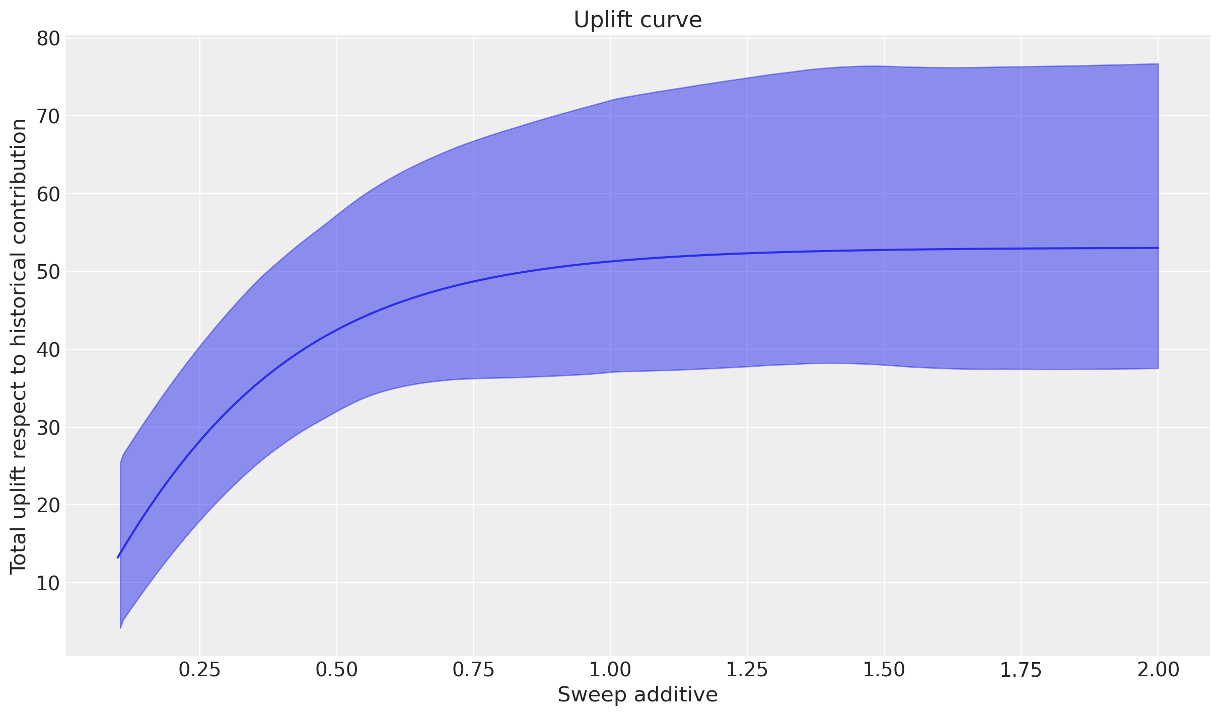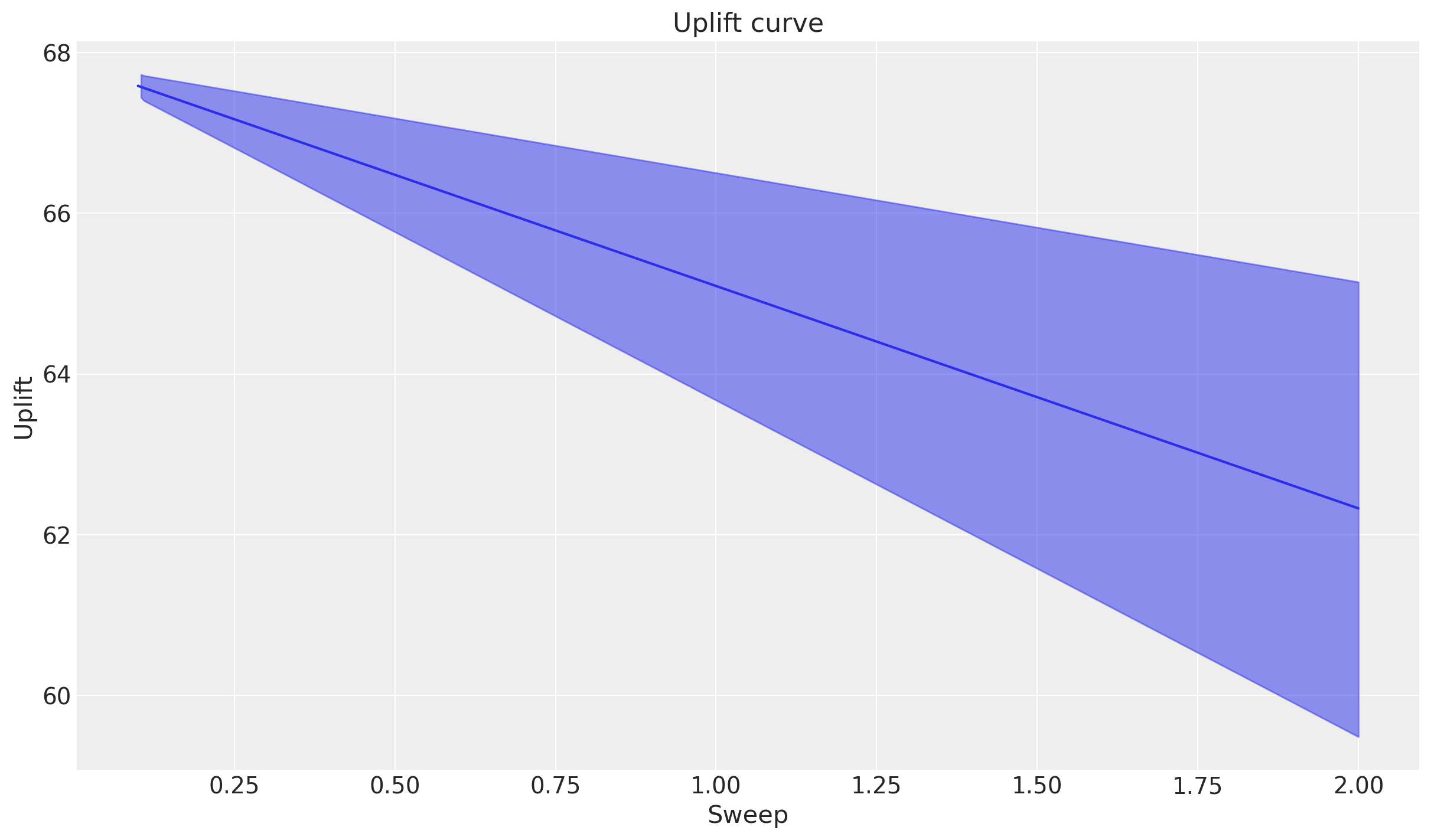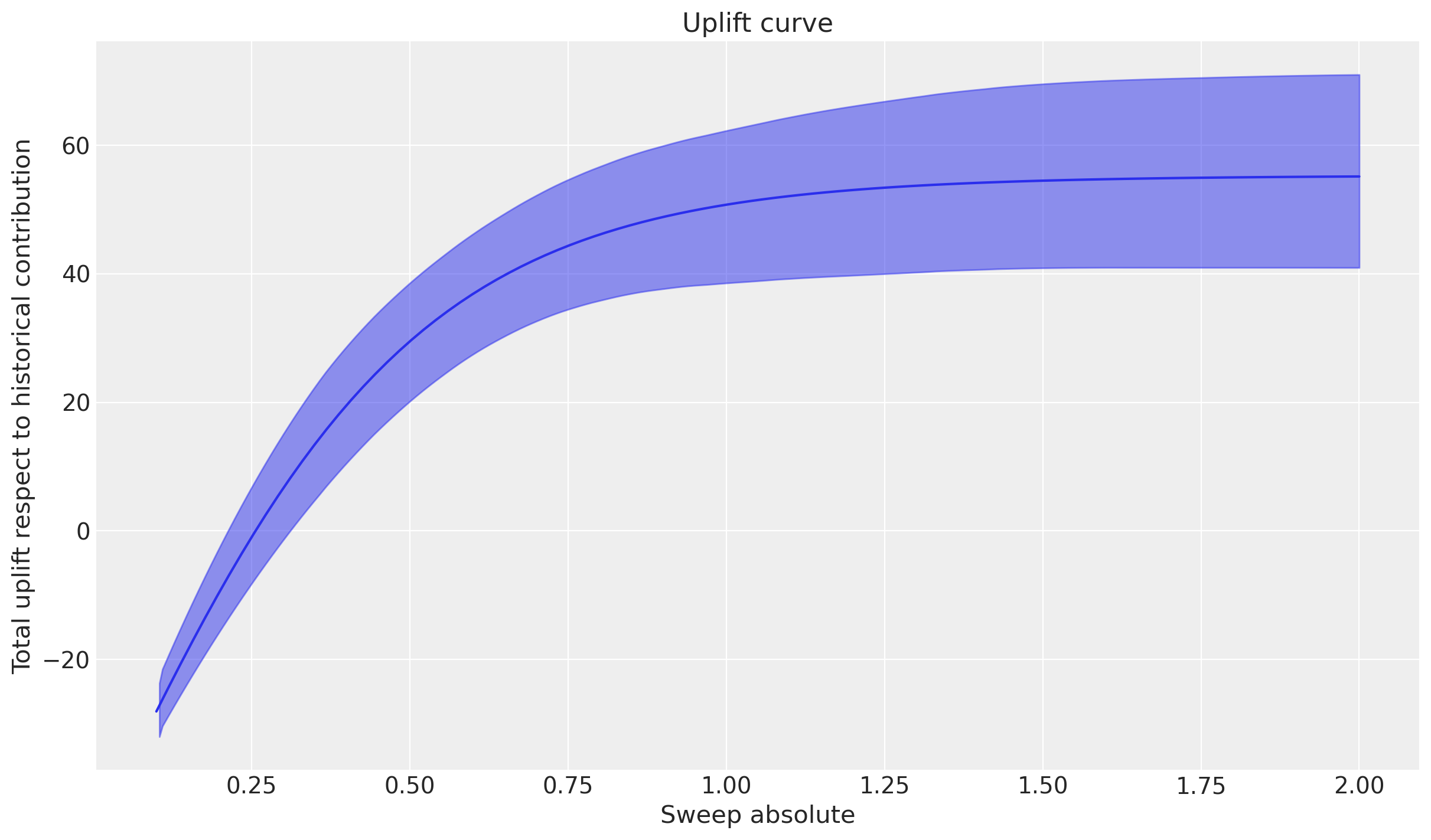 The figure above shows the total expected uplift (it can be positive or negative) for the outcome variable as a function of the sweep values provided. In this case, we used a multiplicative sweep, so the curve is showing how the total outcome would vary if we multiply up (sweep values > 1) or down (sweep values < 1) the influencer spend by the set of values we asked for.