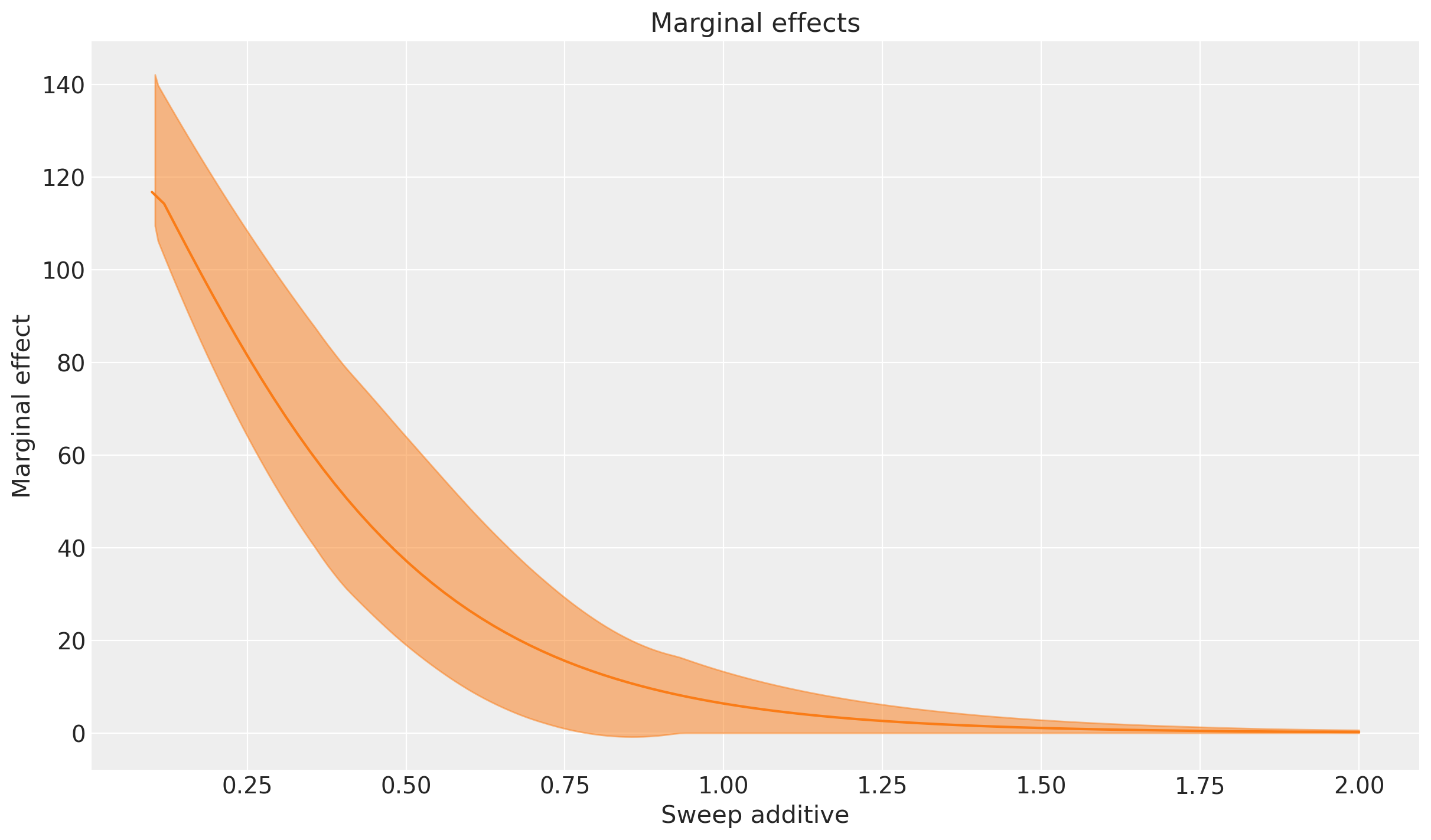 We can see that the highest marginal effects occur on the left side of the plot where we the influence spend is zero or very low. The highest incremental/marginal effects are obtained when we go from no spend to some spend. As we would expect from the previous plot, we still get incremental returns at the current spend levels (multiplicative change of 1.0), and are quite far away from totally saturating this channel - the marginal spend doesn’t reduce to near zero even if we consider a 2x increase in spend.