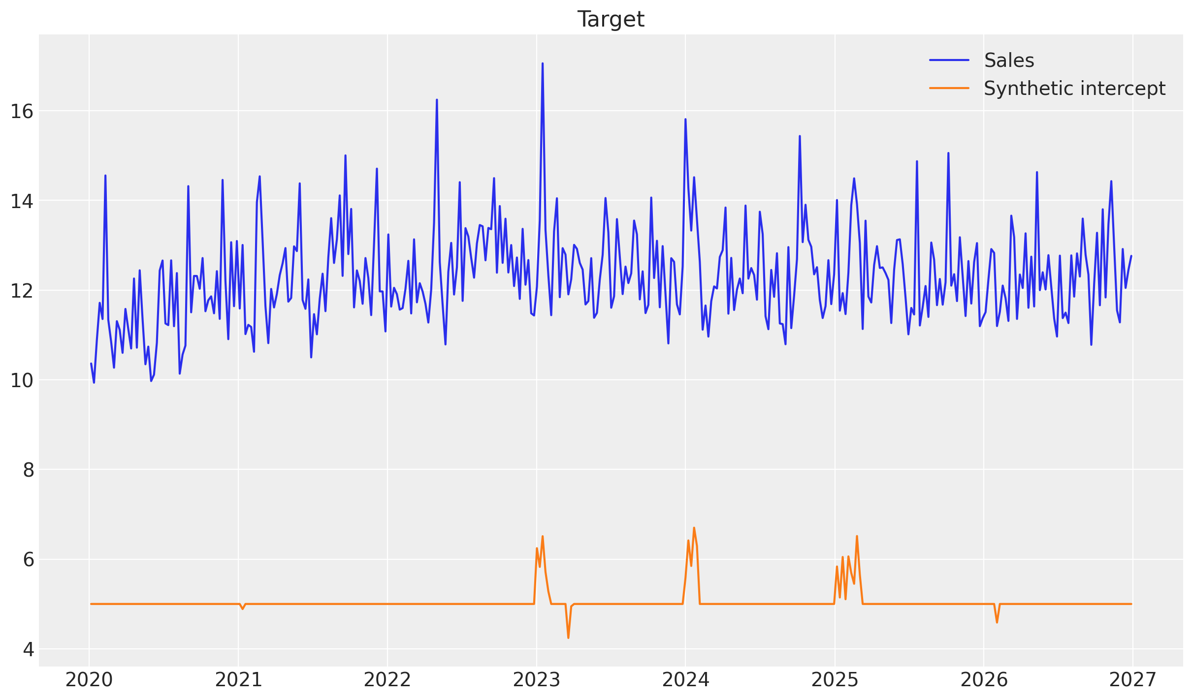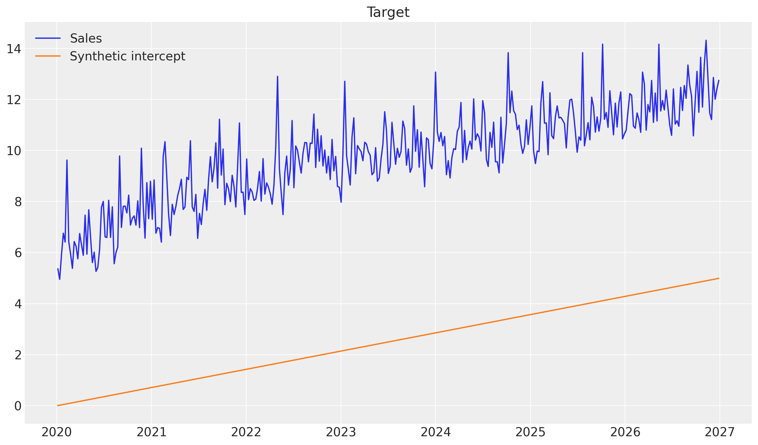 A common pattern in consumer goods sales is that sales are higher in the summer and lower in the winter, or reverse. In this example, we will simulate sales that follow this pattern—by letting the synthetic intercept be a cosine wave—and then see if the model can recover this using a time-varying intercept.